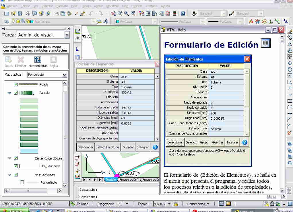 Todos los sistemas de agua y alcantarillado de una ciudad, un cantón, provincia o aún mas, pueden coexistir simultáneamente en ambiente de AUTOCAD, MAP3D (SIG) u otras aplicaciones análogas. Con capacidad para registrar todos los elementos constitutivos de un sistema, georeferenciar, presupuestar, gestionar y modelar dinámicamente simulaciones de agua y alcantarillado, que permite:
