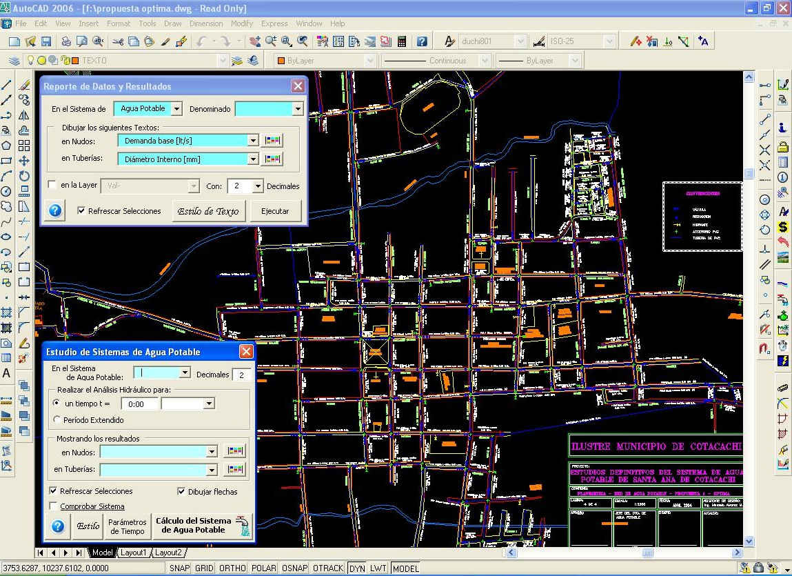 En Cotacachi los datos digitalizados son leídos directamente por el programa para generar la superficie real de la ciudad, en base a la cual se representan los sistemas en forma tridimensional.